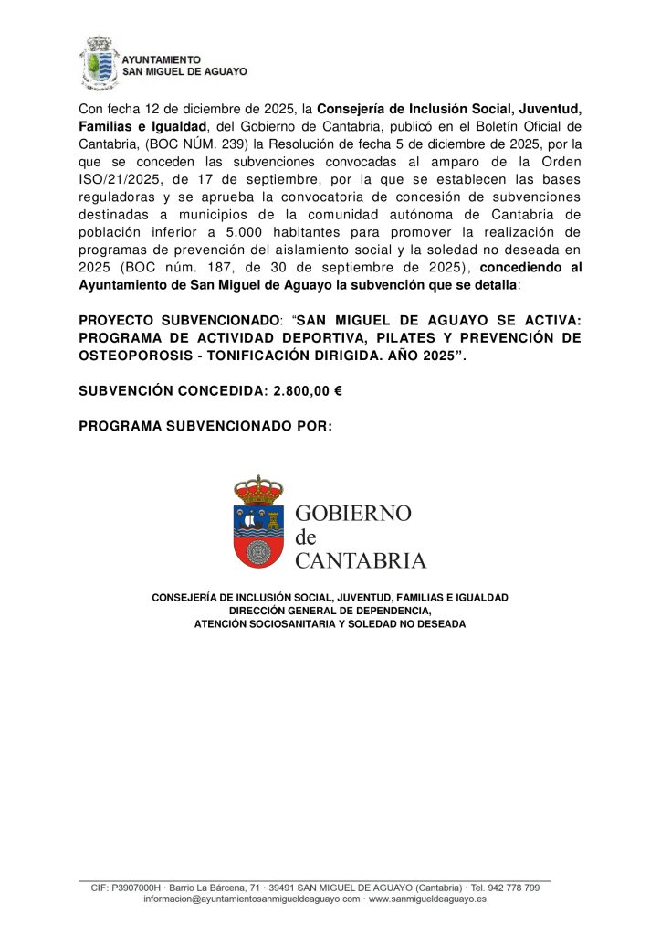 PROYECTO SUBVENCIONADO: «SAN MIGUEL DE AGUAYO SE ACTIVA: PROGRAMA DE ACTIVIDAD DEPORTIVA, PILATES Y PREVENCIÓN DE OSTEOPOROSIS – TONIFICACIÓN DIRIGIDA. AÑO 2025».